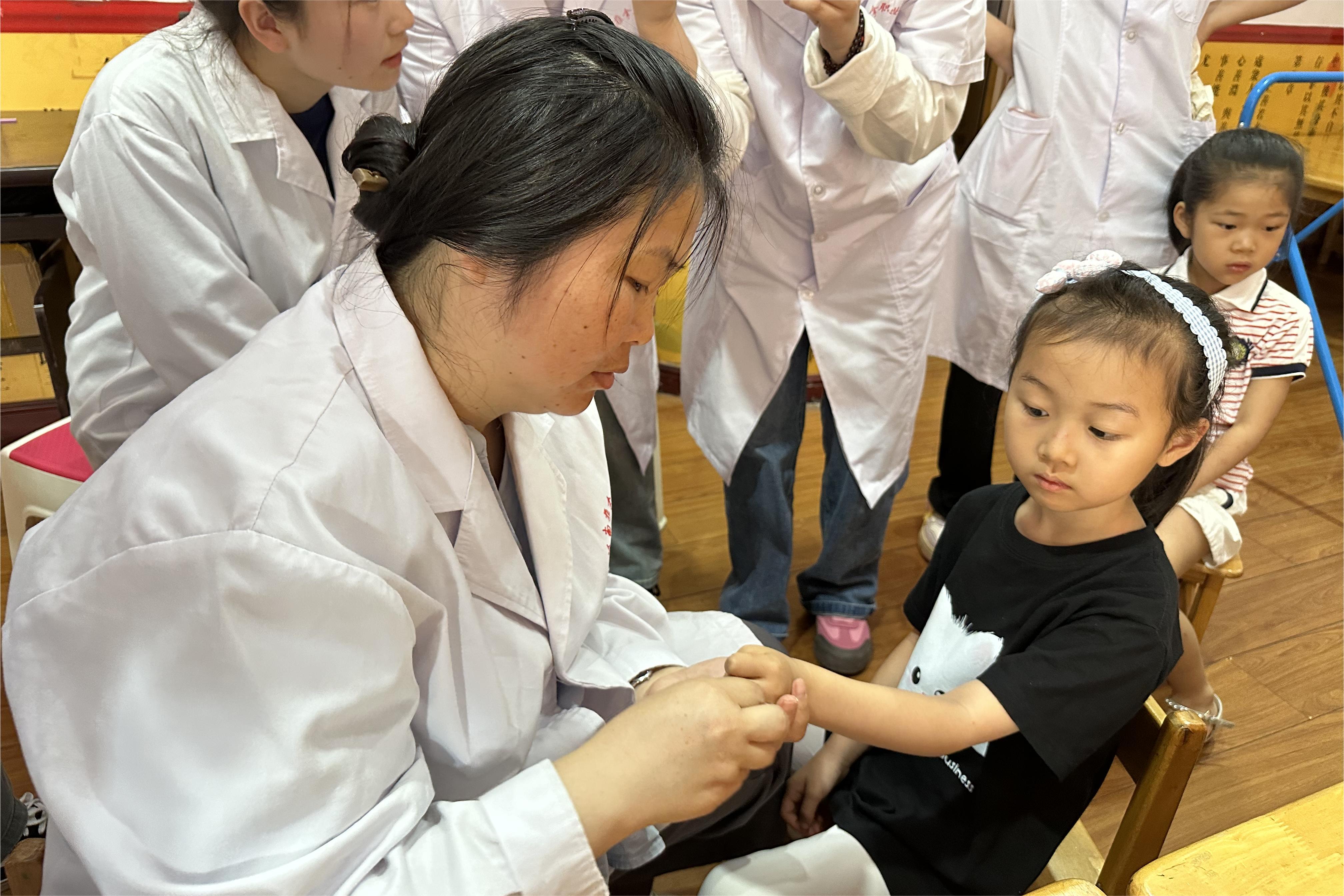 在第74个国际“六一儿童节”来临之际,5月28日下午,针灸推拿系教师党支部党员教师带领学生入党积极分子组成师生义诊团队深入泰伦德幼儿园开展“河洛推拿”义诊志愿服务。