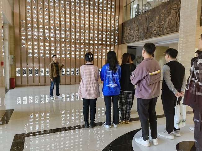 在河洛中医药文化馆序厅,同学们有序参观“悬壶济世”“杏林春暖”“神农尝百草”的沿廊浮雕、描述学院发展历程的歌赋《河洛推拿赋》、镶嵌有“悠悠河洛中医药 赫赫青史荟名家”的七位铜质河洛名医头像,处处展现出大医精诚文化。展厅内从河洛中医药文化发展的历史轨迹,到科普中药与方剂文化知识,再现了河洛地区在中华中医药历史上的摇篮地位,展示了河洛中医药文化的灿烂辉煌。