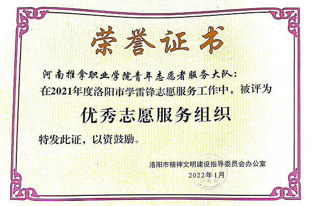 近日,在洛阳市精神文明建设指导委员会组织的2021年度学雷锋志愿服务全国“四个100”和河南省“四个优秀”先进典型宣传推选活动中,学院团委青年志愿者服务大队被评为2021年度洛阳市学雷锋志愿服务“优秀志愿服务组织”。