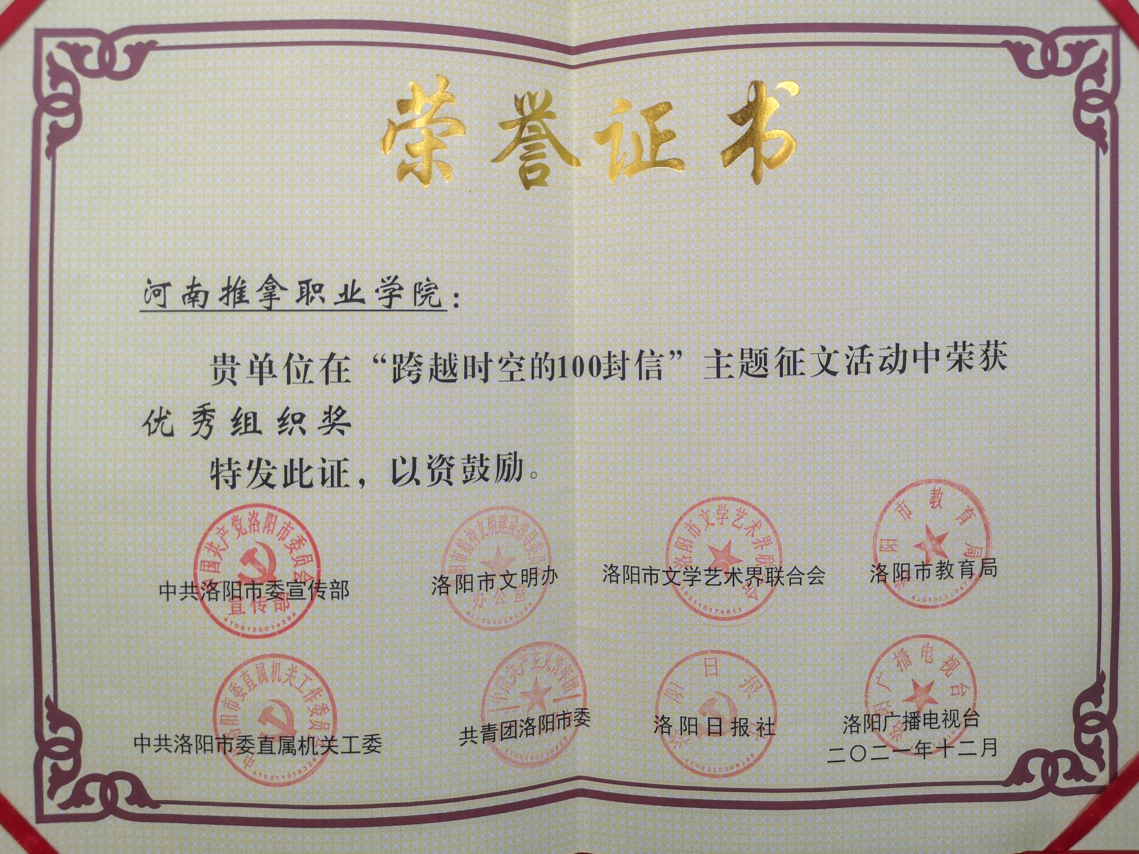 近日,由洛阳市委宣传部、市文明办、市文联联合主办的 “跨越时空的100封信”主题征文活动评奖结果揭晓,河南推拿职业学院共有6名师生获奖,学院荣获优秀组织奖。