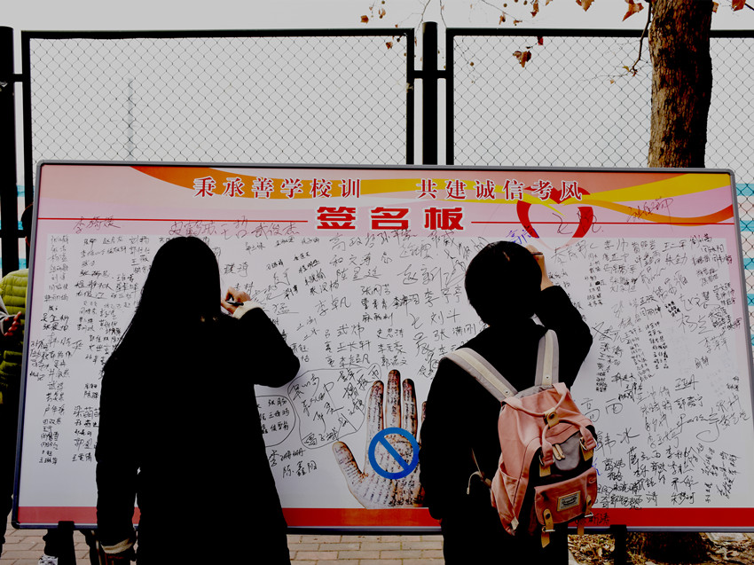 在本学期期末考试到来之际,12月28日上午,“秉承善学校训,共建诚信考风”的诚信考试签名活动在学院餐厅西门口举行。教务处和学生处(团委)联合向全院学生发出诚信考试倡议。