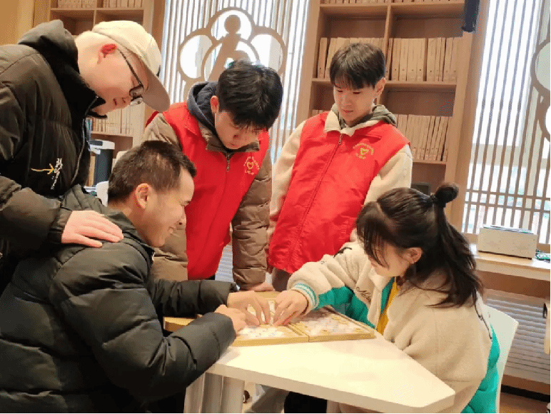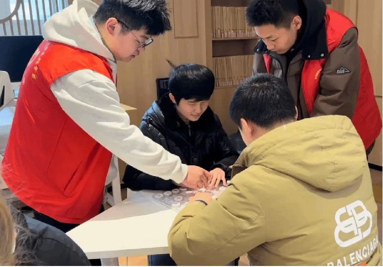 “同学,红棋边缘带有锯齿,黑棋边缘是光滑的。”“每一个棋子上有凸起的圆点标记,帅是6个点,士是5个点,相是4个点,用手指触摸棋子来分辨一下。”走进阅览室就听到志愿者们在为视障学生认真讲解象棋规则,视障学生们边学习边摸索前进。