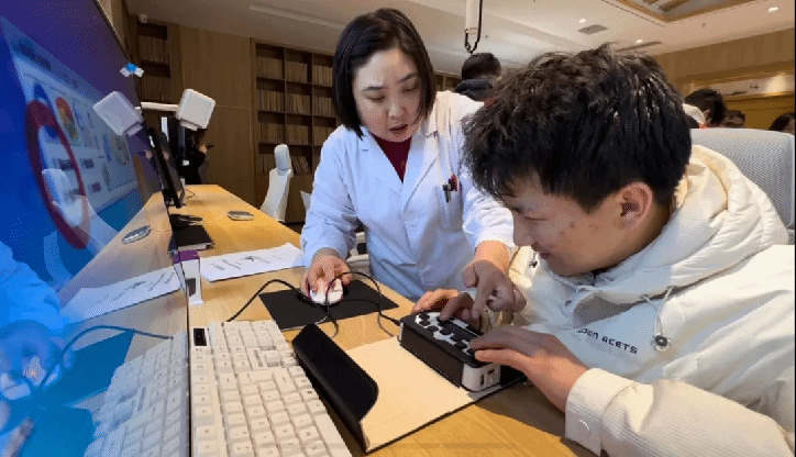 社团指导老师手把手教视障学生使用阅览室盲文点显器、助视器等盲用硬件设备,希望能够帮助视障学生接触到更多的文化作品,助力视障学生共品书香。