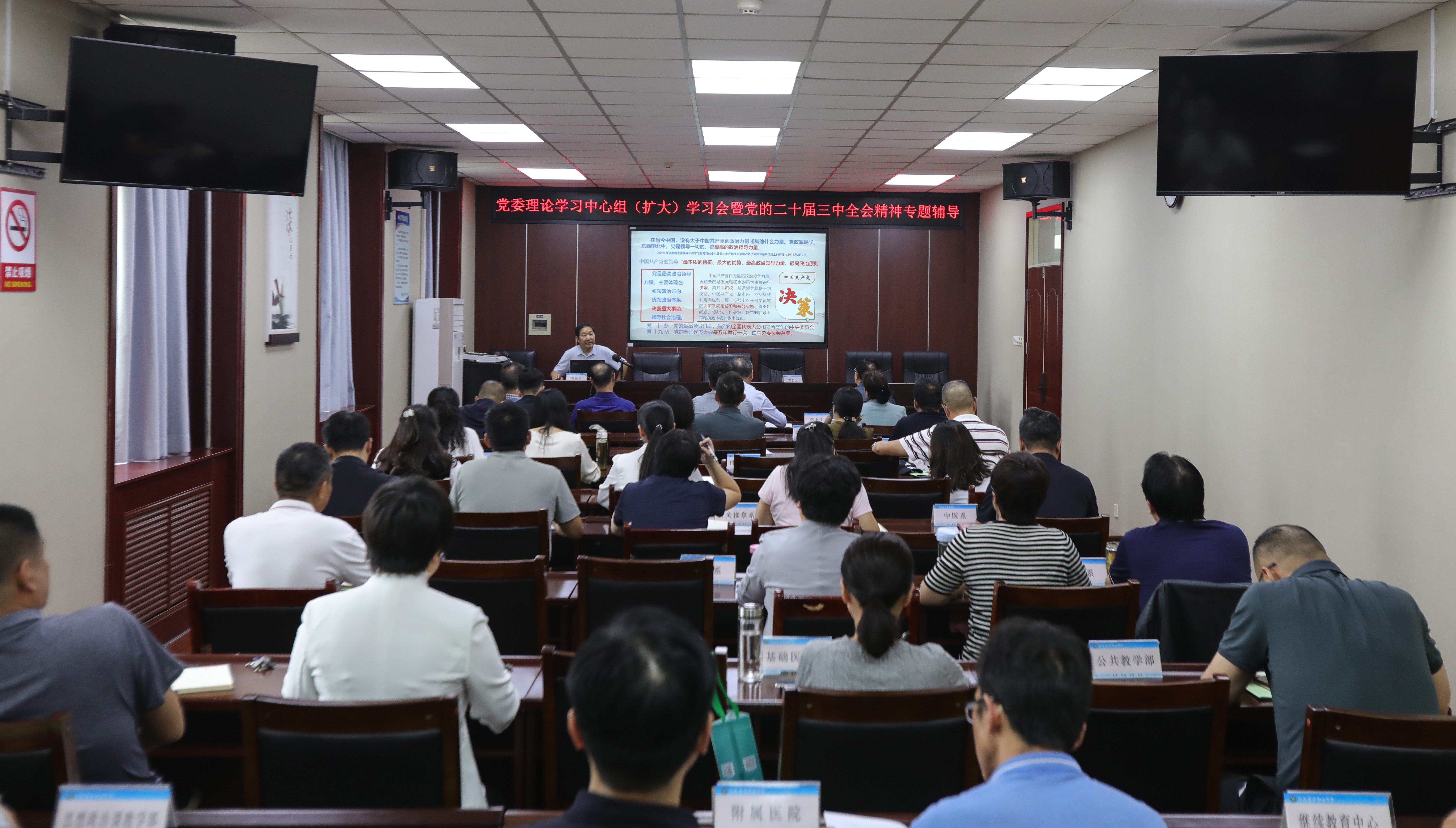按照院党委印发的《河南推拿职业学院学习贯彻党的二十届三中全会精神宣讲工作方案》和党委理论学习中心组年度学习计划安排,9月26日下午,院党委理论学习中心组(扩大)进行第二次党的二十届三中全会精神集中专题学习,邀请省委党的二十届三中全会精神宣讲团成员、河南省社科联兼职副主席、河南省工人运动理论研究会会长、河南科技大学马克思主义学院院长刘振江教授为大家进行集中宣讲和专题辅导。专题辅导报告会由院党委副书记杜占彪主持。
