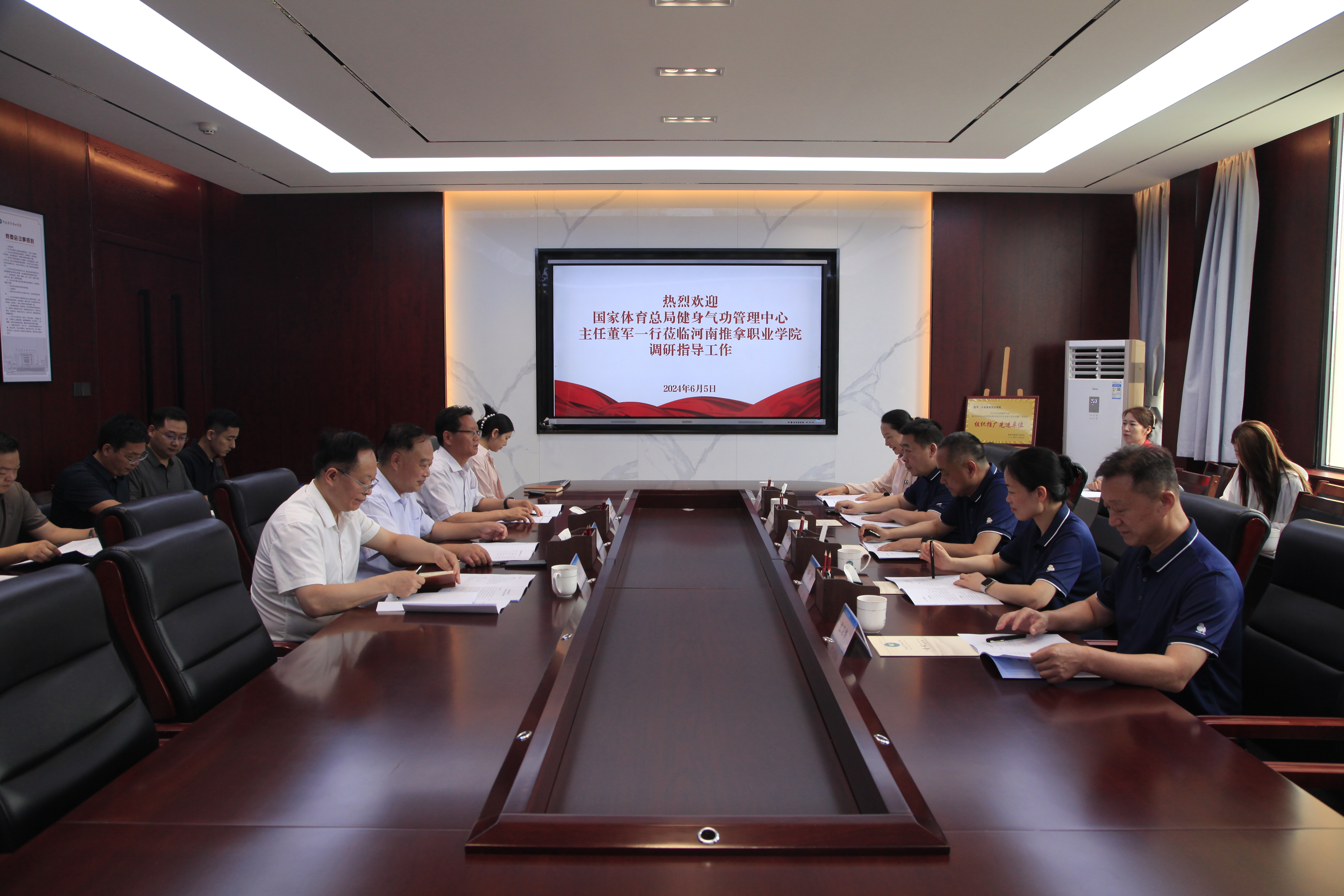 6月5日上午,国家体育总局健身气功管理中心主任董军、国家体育总局健身气功管理中心对外发展部主任朱颖、河南省全民健身中心副主任李罡、洛阳市体育局副局长张荣华、洛阳市健身气功协会会长祝京媛到我院调研指导工作,中国体育报等多家主流媒体随行报道。学院党委书记韦保新,院长陈相新,副院长李中良及相关部门主要负责人陪同调研。