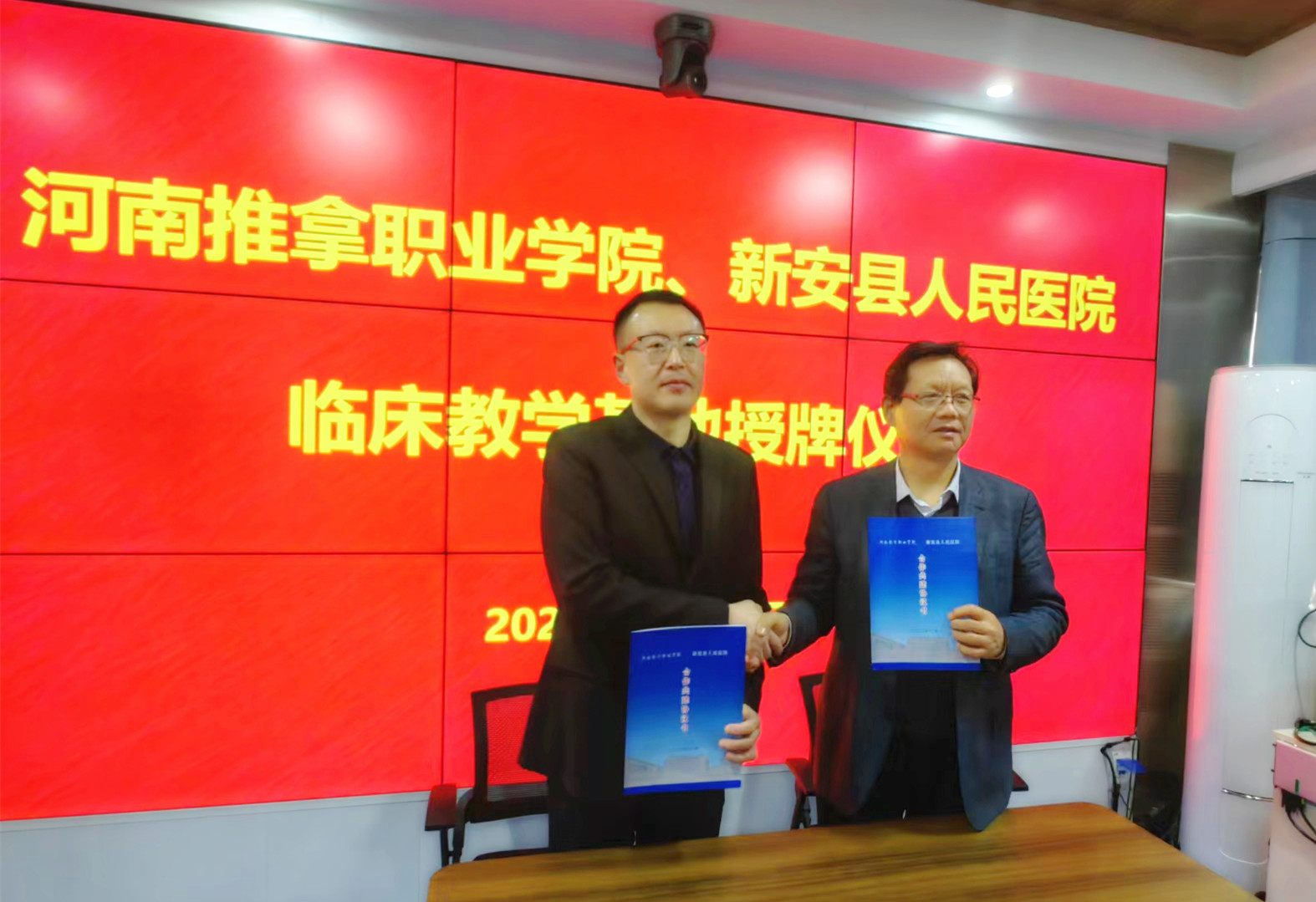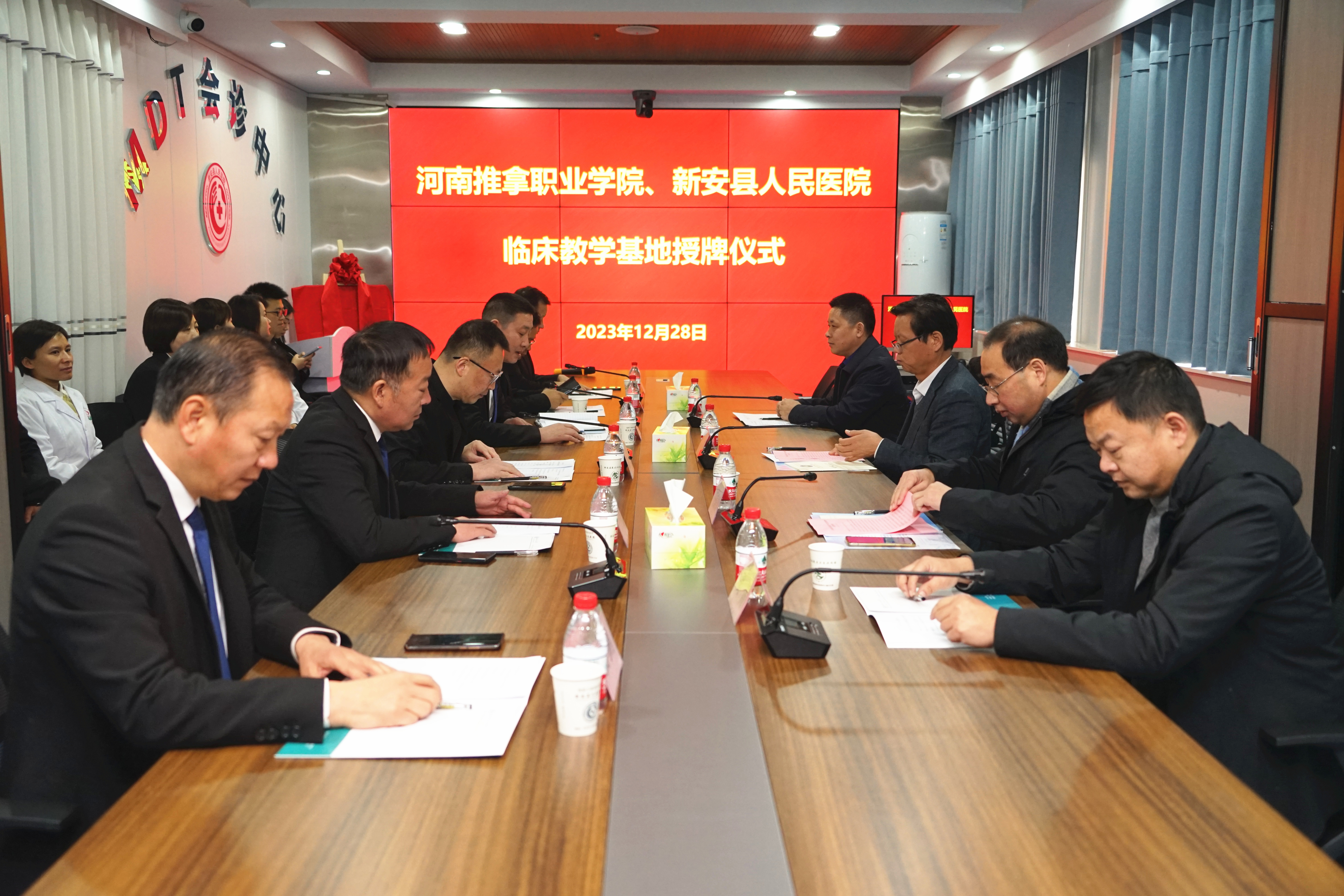 12月28日,河南推拿职业学院、新安县人民医院合作共建签约暨新安县人民医院成为河南推拿职业学院教学医院揭牌仪式在新安县人民医院举行。新安县人民医院党委书记、院长柳杨,学院院长陈相新,副院长王轶群,学院办公室、教务处负责同志和新安县人民医院领导班子成员、各行政职能科室负责同志参加了签约暨揭牌仪式。仪式由新安县人民医院党委副书记、副院长张晓东主持。