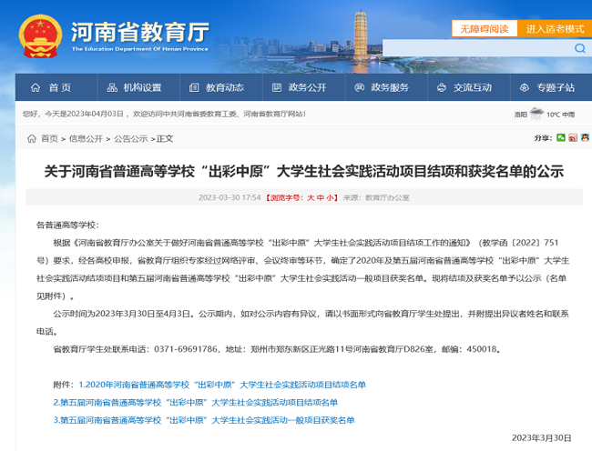 近日,河南省教育厅公布了第五届河南省普通高等学校“出彩中原”大学生社会实践活动项目结项和获奖名单,由我院中医系宋朝功负责,郭少淳、张立黎指导的《脊柱健康中原行动》社会实践项目顺利结项并获得二等奖。