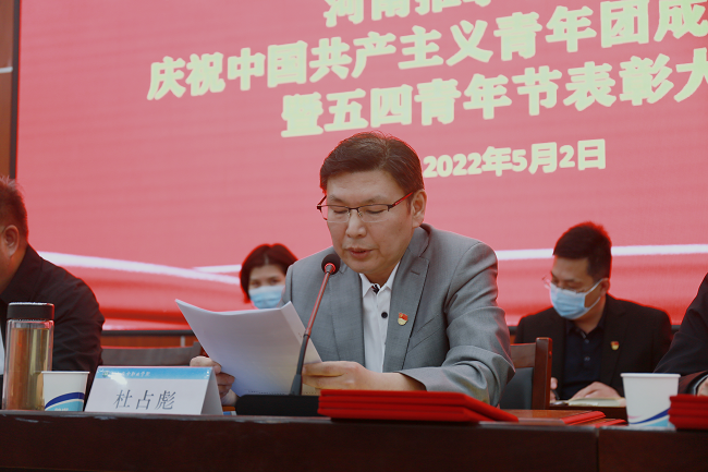 杜占彪同志宣读了《共青团河南推拿职业学院委员会关于表彰2021年度五四红旗团支部、优秀共青团员、优秀共青团干部的决定》,授予针灸推拿系2020级针灸推拿专业6班团支部等10个团组织五四红旗团支部称号;授予张晨晖等233 名同志优秀共青团员称号;授予马倩雅等88名同志优秀共青团干部称号。随后,参会领导为受表彰的集体、个人颁奖并表示祝贺。