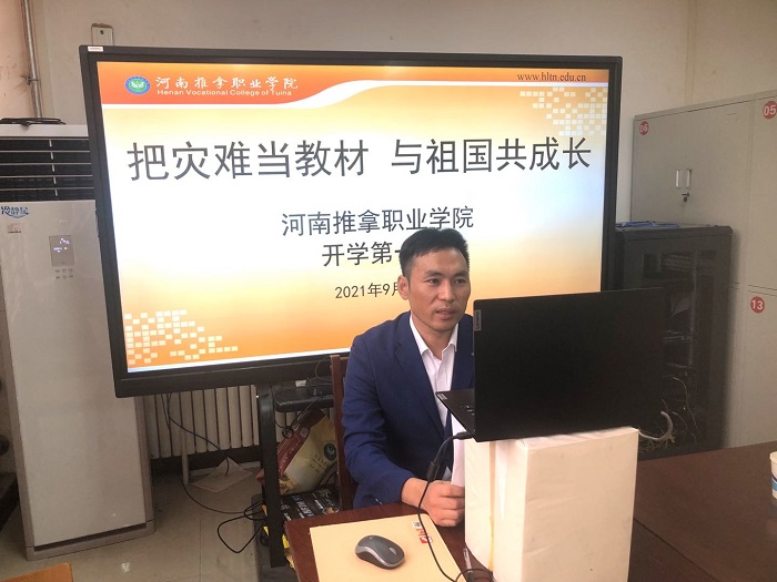 活动在庄严的升国旗仪式中启动,国歌奏响,国旗飘扬,全体师生严肃立正,向国旗行注目礼,气氛庄严热烈,展现出河推人深深的爱国、爱党、爱校之情和朝气蓬勃、积极向上的精神状态。首先,教务处处长吴涛对2021年秋季学期线上教学工作进行整体部署,要求各教学单位、全院师生各司其职,认真做好线上教学准备,确保按质按时完成教学任务。随后,思想政治课教学部副主任张珊围绕暑期防汛救灾和疫情防控,作了《在灾难中凝聚起强大的中国力量》主题报告,她深入挖掘防汛救灾和疫情防控过程中涌现出的先进典型、英雄人物和感人事迹等鲜活事例,以育人为主线,加强对学生思想政治教育和价值观引领,为全院师生提供坚强的思想保证和精神动力。接下来,2019级中医学专业学生赵晨晨、2020级中医骨伤专业学生宋修身作为抗洪抗疫代表发言,他们不惧个人安危,主动冲锋在前,积极投身防汛救灾和疫情防控工作,协助乡镇、社区做好动员排查、物资保障、便民服务等工作,以实际行动彰显河推人担当。最后,附属医院副院长李慧鑫就目前德尔塔变异毒株的蔓延疫情防控形势,为师生进行疫情防控知识培训,有效提高大家疫情防控意识和能力。