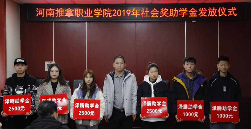 12月26日上午,学院2019年社会奖助学金发放仪式在二楼视频会议室举行。副院长王轶群,无锡好轻松盲人推拿有限公司董事长严三媛,洛阳泽腾餐饮管理有限公司总经理张俊峰,北京京洛健康科技有限公司总经理杨晓成,学生处(团委)、各系部负责人及80余名学生参加了发放仪式。
