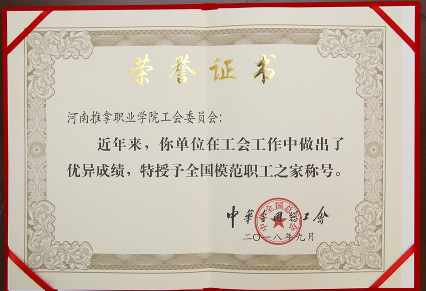 “全国模范职工之家”荣誉称号由中华全国总工会设立,是全国工会系统每4年评选一次、表彰先进集体的最高荣誉,也是国家对基层工会工作的最高褒奖。此次荣誉是继学院工会被河南省总工会命名为“国有企事业基层工会规范化建设示范点”单位后又增添的一项国家级殊荣。