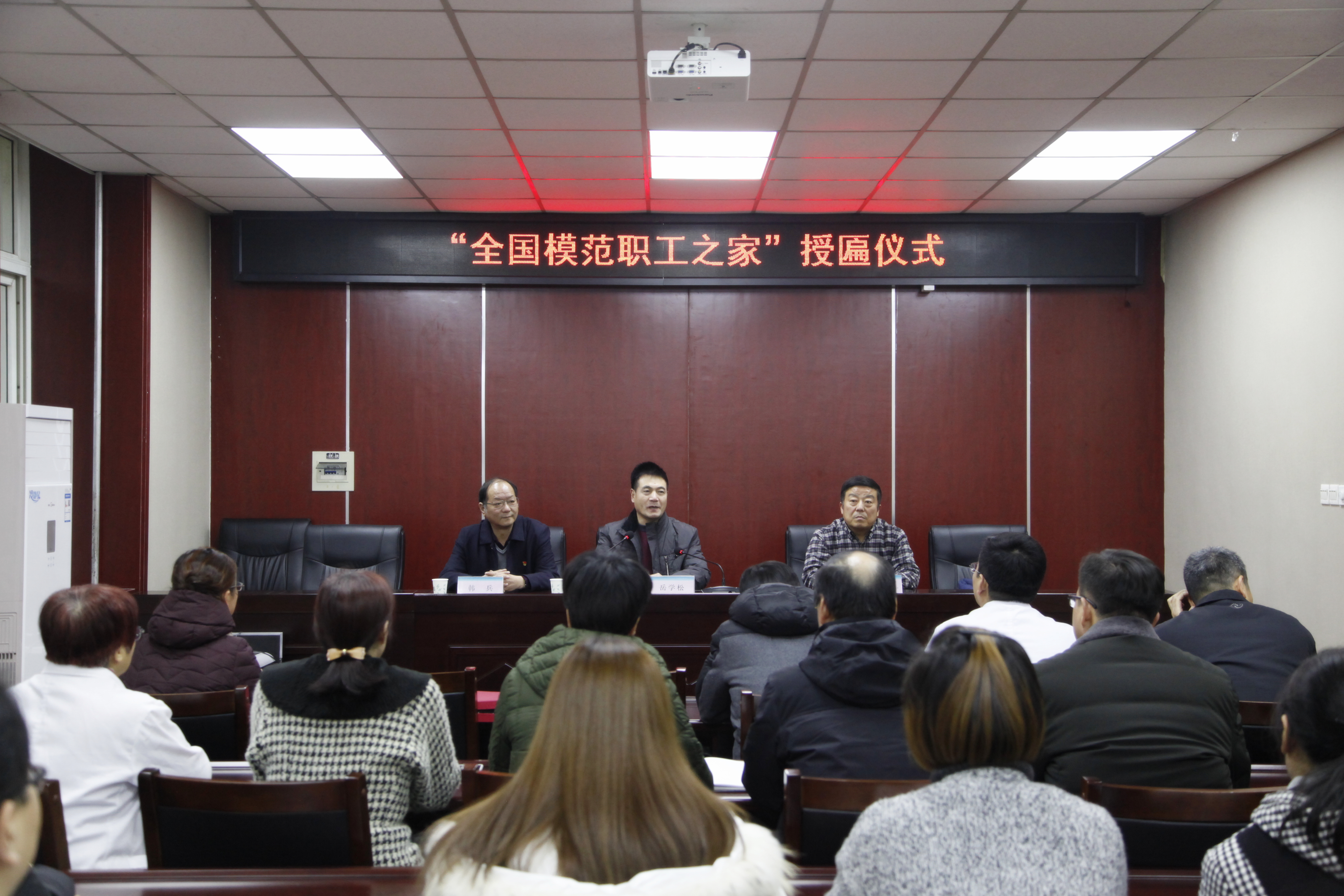 12月10日下午,洛阳市总工会教科文卫体工会主席岳学松一行莅临我院,向学院工会颁发由中华全国总工会授予的“全国模范职工之家”牌匾和荣誉证书。学院工会委员会全体委员和工会小组长参加了授匾仪式。