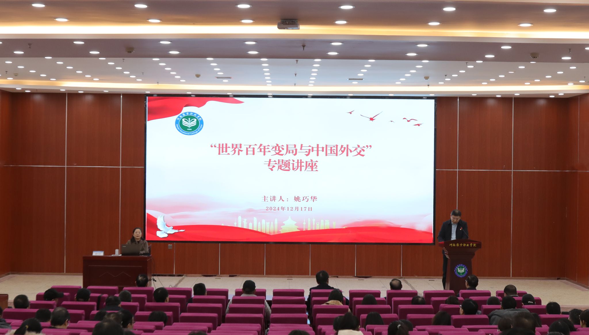 12月17日下午,中共河南省委党校姚巧华教授应邀到我院开展“世界百年变局与中国外交”专题讲座。讲座由学院党委副书记杜占彪主持。党委理论学习中心组全体成员,全体中层干部,全体教职工,各系部学生代表在现场听取讲座。