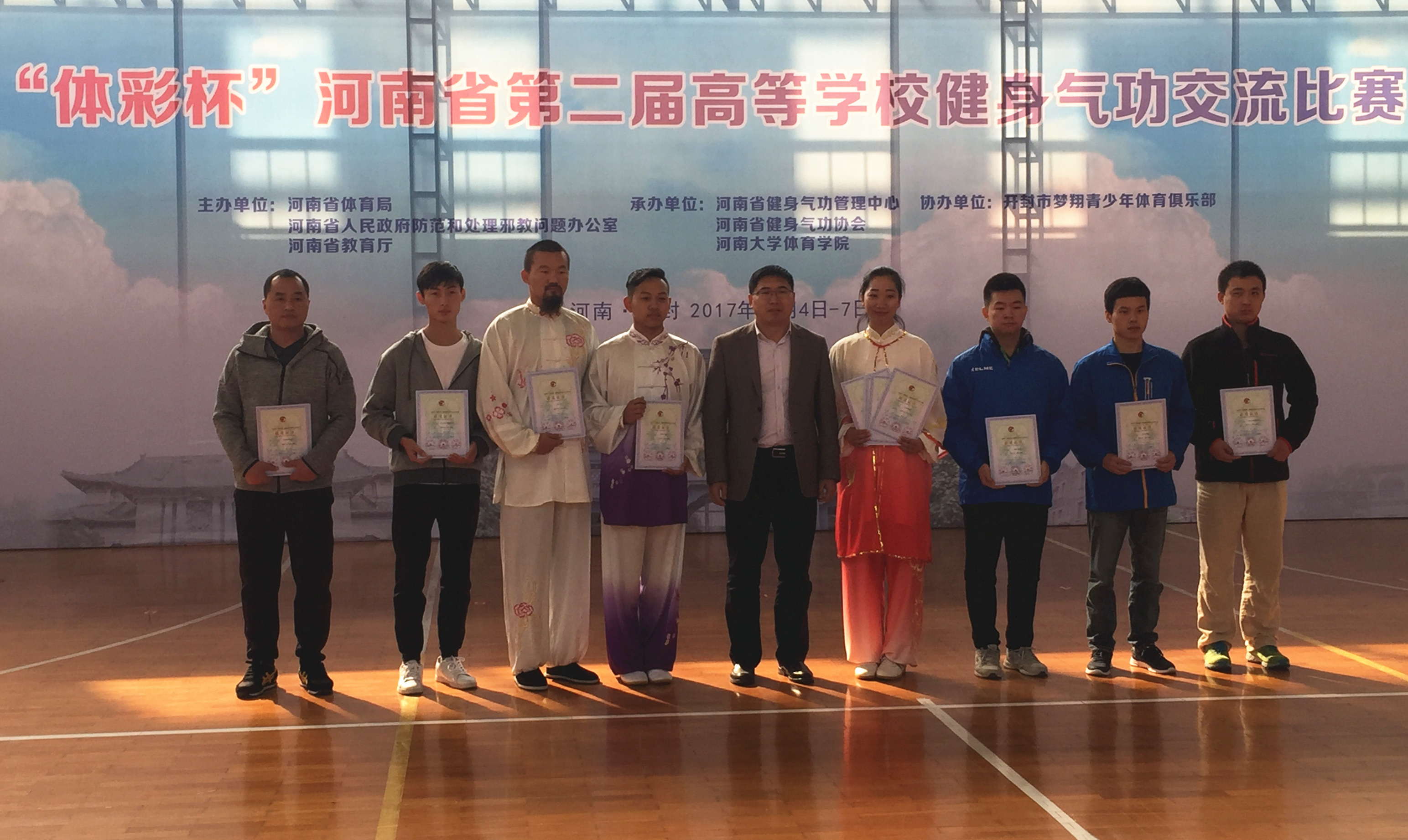 11月6日至7日,由河南省体育局、河南省人民政府防范和处理邪教问题办公室、河南省教育厅主办的河南省第二届高等学校健身气功交流比赛在河南大学举行。来自全省24所高校的130余名运动员参加了本次比赛。我院派出由教务处吴涛处长任教练,马珊、陈军、庞继辉、王亚楠4名教职工组成的代表队参加了比赛。