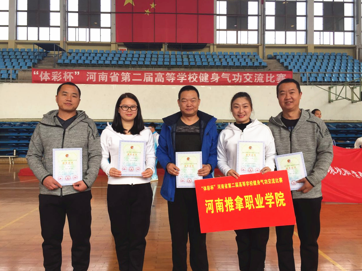 比赛项目设置有五禽戏、易筋经、六字诀、八段锦等,分为个人赛和团体赛。我院代表队在赛场上斗志昂扬、不畏强手,展示出了河推师生良好的精神面貌和运动竞技水平。经过两天的激烈角逐,我院与郑州大学体育学院、新乡医学院、河南工业大学、周口师范学院、郑州轻工业学院、郑州大学、郑州大学西亚斯国际学院共同荣获八段锦团体赛前八名;个人项目比赛中,马珊同志获八段锦女子个人赛第二名及体育道德风尚奖,吴涛同志被评为优秀教练员。