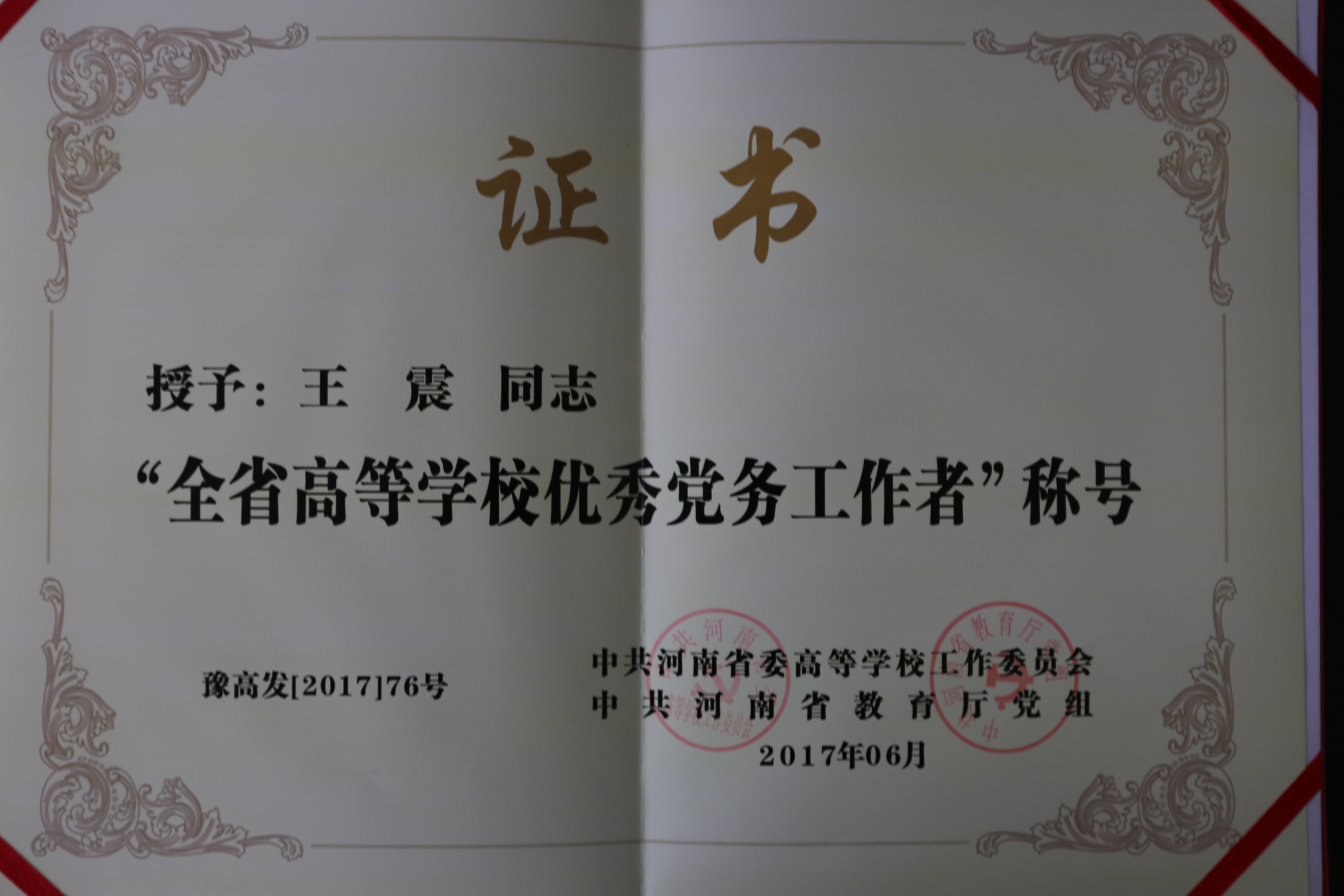在庆祝建党96周年之际,为展示委管高校基层党组织和党员学习贯彻新时期党建工作新要求,在高校党建工作中取得的丰硕成果。中共河南省委高校工委、中共河南省教育厅党组研究决定,对在委管高校创先争优活动中涌现出来的一批优秀共产党员、优秀党务工作者和先进基层党组织进行表彰。授予全省高校284名同志“全省高等学校优秀共产党员”荣誉称号,152名同志“全省高等学校优秀党务工作者”荣誉称号,153个基层党组织“全省高等学校先进基层党组织”荣誉称号。