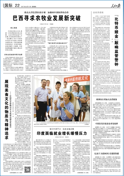 今日出版的《人民日报》第22版报道:6月13日,来自美国的18名青年学生在河南推拿职业学院开展中医传统文化学习交流。图为一名学生在亲身体验中医推拿后竖起大拇指表示赞赏。