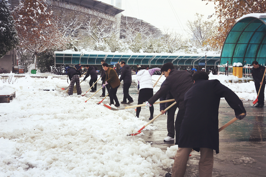 11月22日,洛阳市迎来今冬第一场雪,厚厚的积雪把校园装点成银装素裹的洁白世界,平添了几分冬日的独特魅力。今晨,皑皑白雪在给师生带来别样欢乐的同时,也为正常出行增添了不便。即将上班时刻,党委书记韦保新、院长娄赟和其他院领导,各部门负责人以及20余名教职工一起主动清扫校园内的坚冰积雪道路。