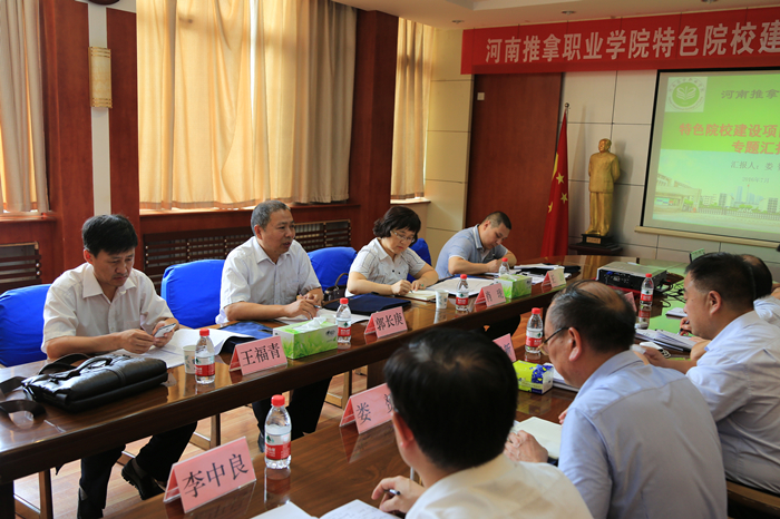 7月9日,以许昌职业技术学院副院长郭长庚为组长的省教育厅专家组一行4人,来我院实地检查验收特色院校项目建设,并在行政楼二楼会议室召开了检查验收汇报会。院领导韦保新、娄赟、王松泉、李中良、陈国军和院属各部门主要负责人参加汇报会。汇报会由党委书记韦保新主持。