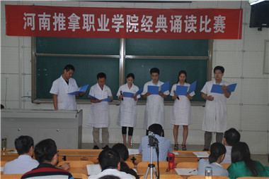 根据《河南省民政厅直属机关党委委员会关于举办全厅职工经典诵读比赛活动的通知》(豫民党[2015]16号)文件精神,经院党委书记韦保新,院长娄赟批准,6月17日下午,由学院工会主办,院团委和教务处协办以“传承文化·提升素质”为主题的“河南推拿职业学院教职工经典诵读比赛”在第七阶梯教室举行。副院长李中良,副院长陈国军,工会主席张志强出席,近百名师生观看了比赛。