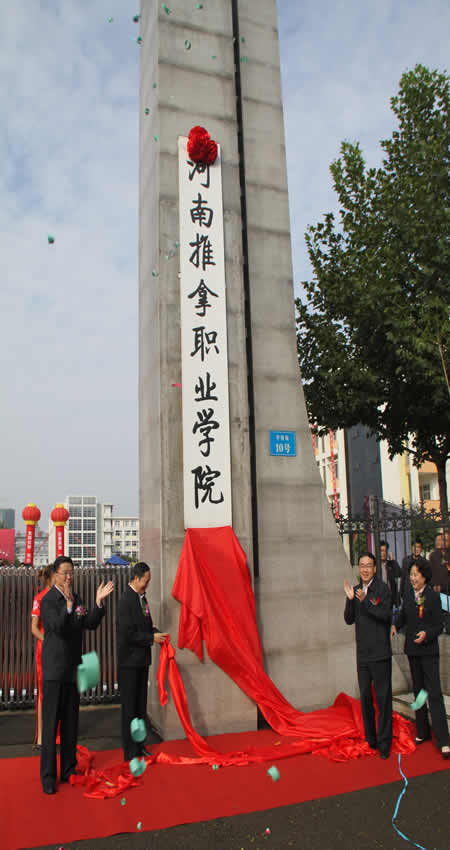 一路高歌唱凯旋,励精图治铸华章。2011年9月19日,学校广场鲜花锦簇、彩球飘扬、音乐欢快,整个校园洋溢在热烈、浓郁的喜庆氛围中。上午8时30分,河南推拿职业学院揭牌仪式隆重开幕。