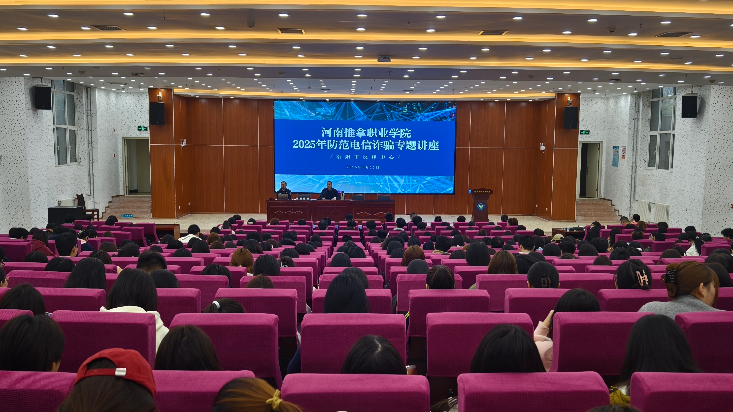 为进一步增强师生防范电信诈骗意识,提升识诈防诈能力,切实保障师生财产安全,3月11日下午,学校邀请洛阳市公安局洛龙分局政保大队教导员闫智卿、反诈中心民警程兵以及古城派出所副所长马毅波、古城街道东方今典社区党总支书记刘芳等一行在学术报告厅联合举办2025年防范电信诈骗专题讲座。全校师生代表400余人聆听讲座。