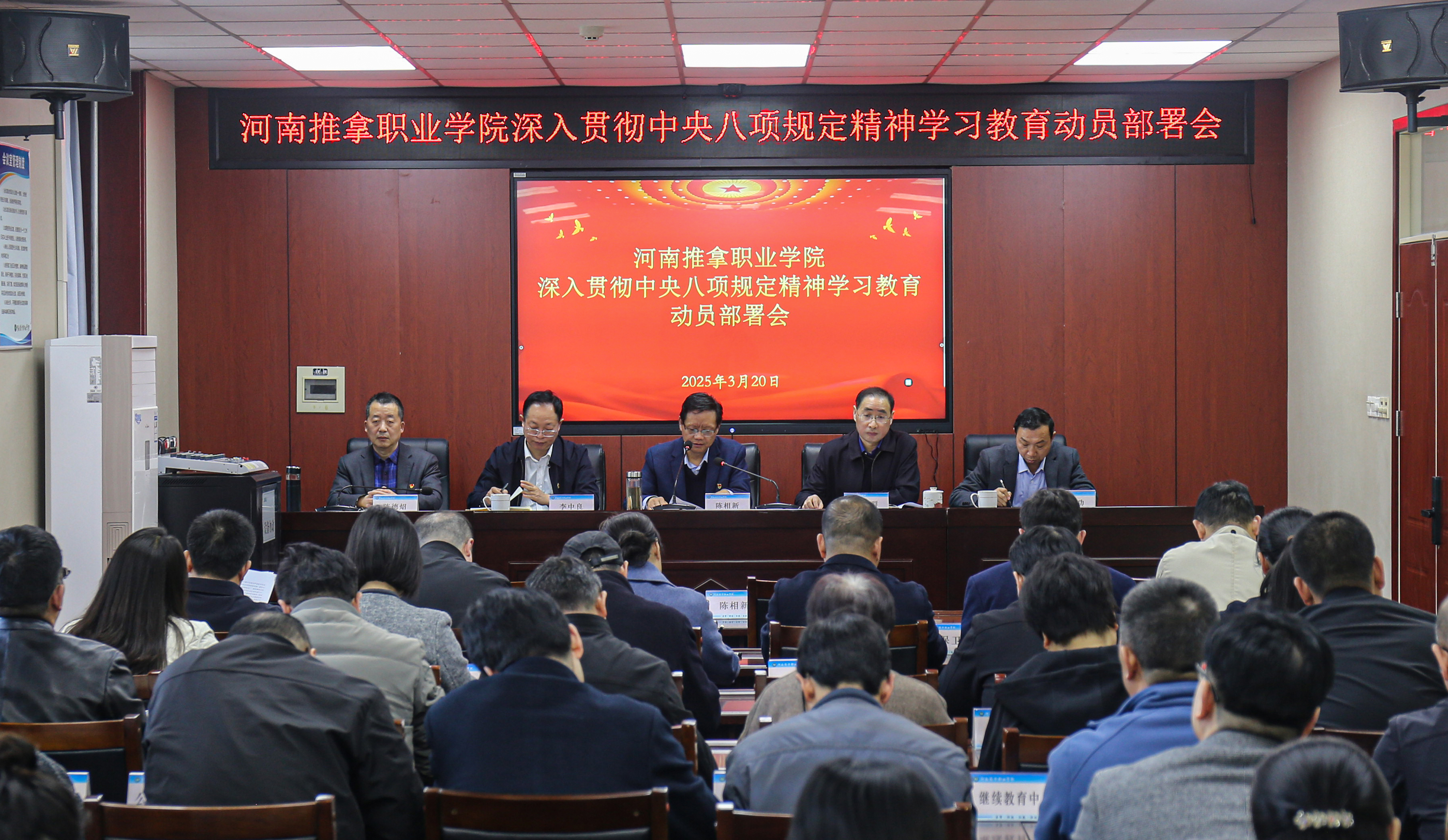 陈相新就扎实开展好本次学习教育提出三方面要求,一是要切实提高政治站位,深刻认识开展学习教育的重大意义和实践要求,开展深入贯彻中央八项规定精神学习教育,是巩固深化主题教育和党纪学习教育成果、纵深推进全面从严治党的重要举措。二是要快速响应、抓紧行动、强化组织领导、压实责任链条,学校领导班子成员要认真履行“一岗双责”,各党总支、支部负责人要扛起第一责任人职责,扎实完成各项任务。三是以学有质量、查有力度、改有成效为重要标准,推动学习教育有序有效开展,切实把作风建设贯穿到管党治党、办学治校、立德树人全过程各方面,把学习成果转化为深化办学治校综合改革的强大动力。