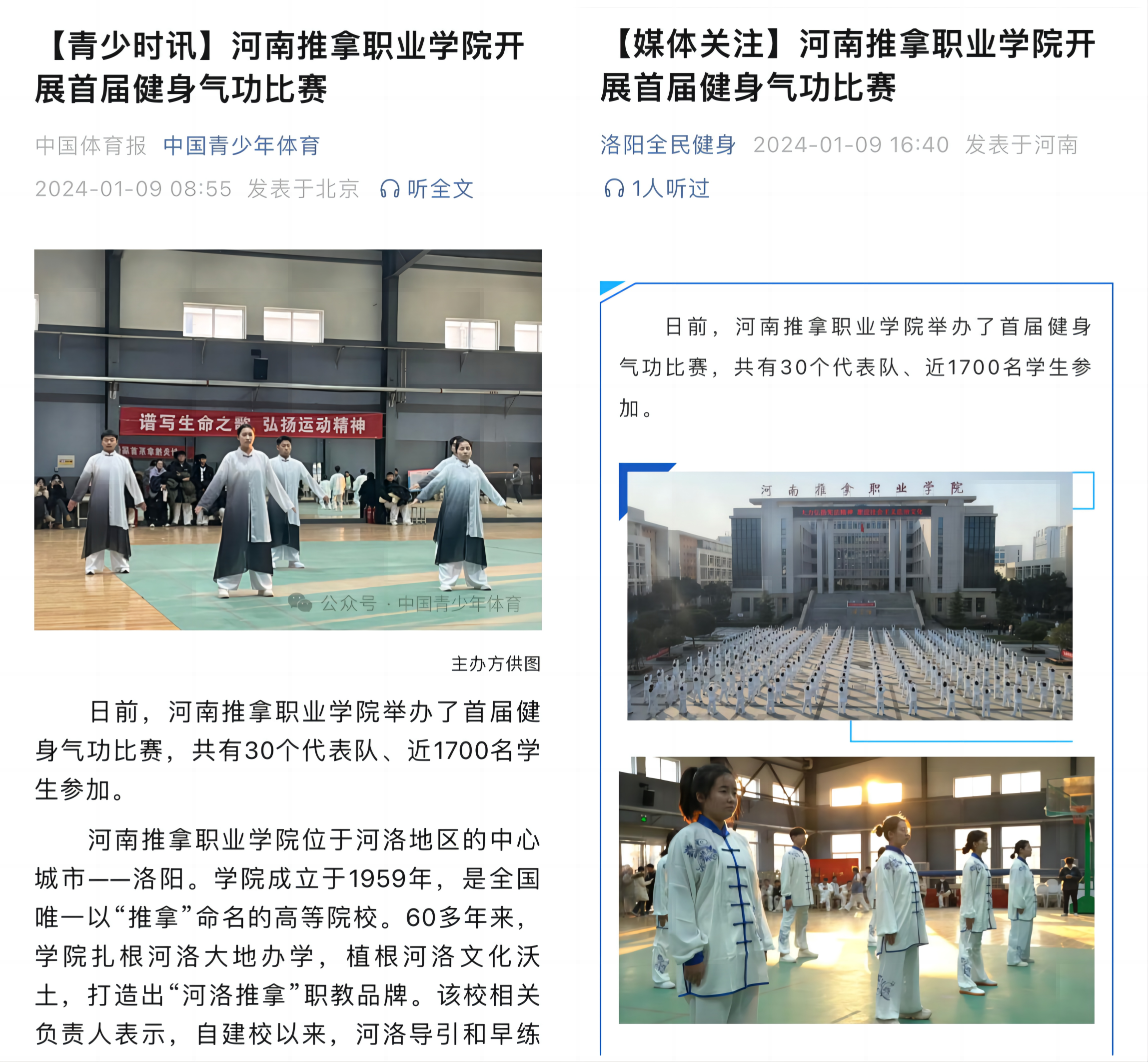 日前,我院举办了首届健身气功比赛,共有30个代表队,近1700名学生参加。千人共习八段锦的场面吸引了国家体育总局官网、中国体育报、新浪网等多家主流媒体关注报道。