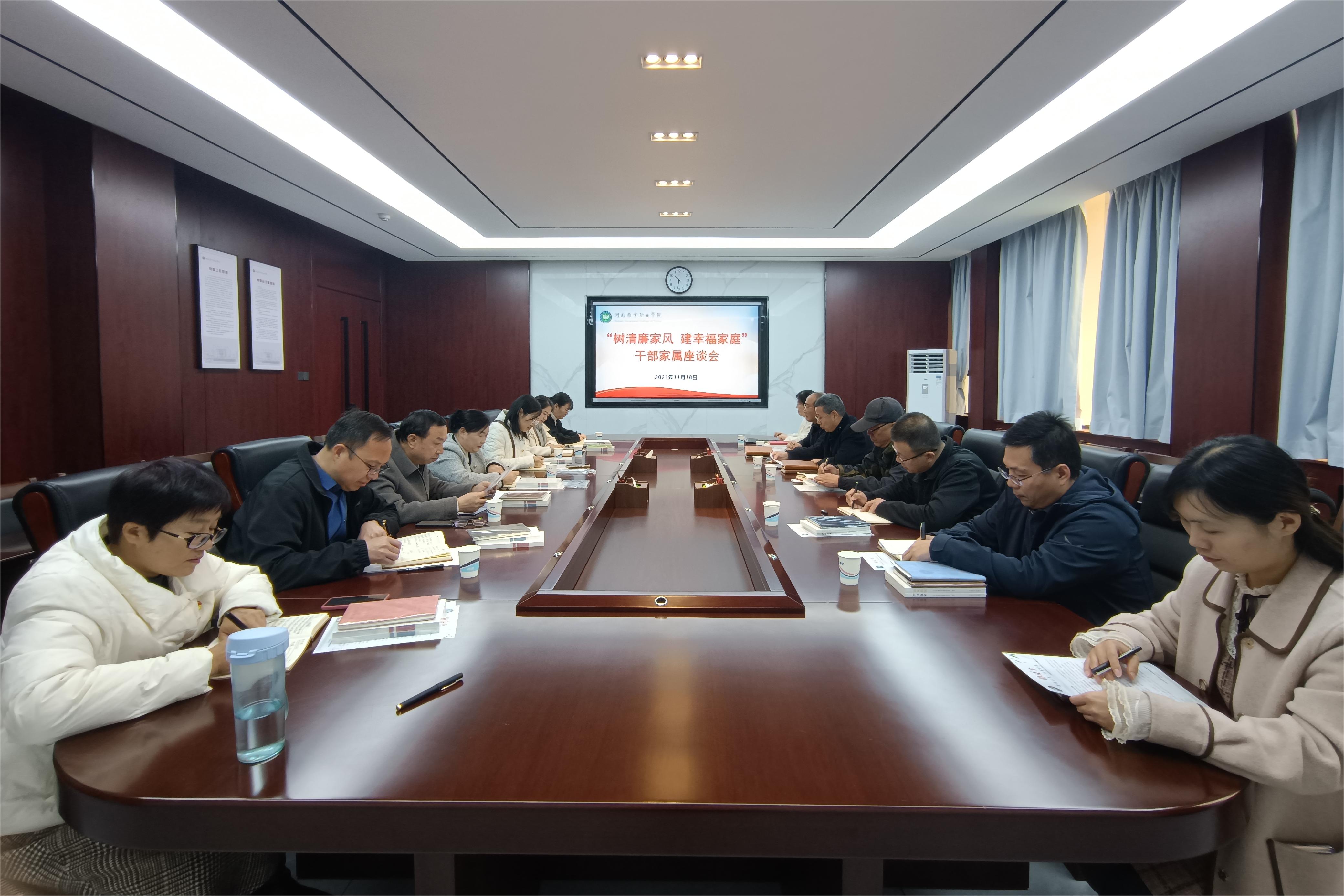 11月10日,学院在行政楼二楼会议室召开“树清廉家风 建幸福家庭”领导干部家属座谈会,相关部门负责人及家属代表参加会议。