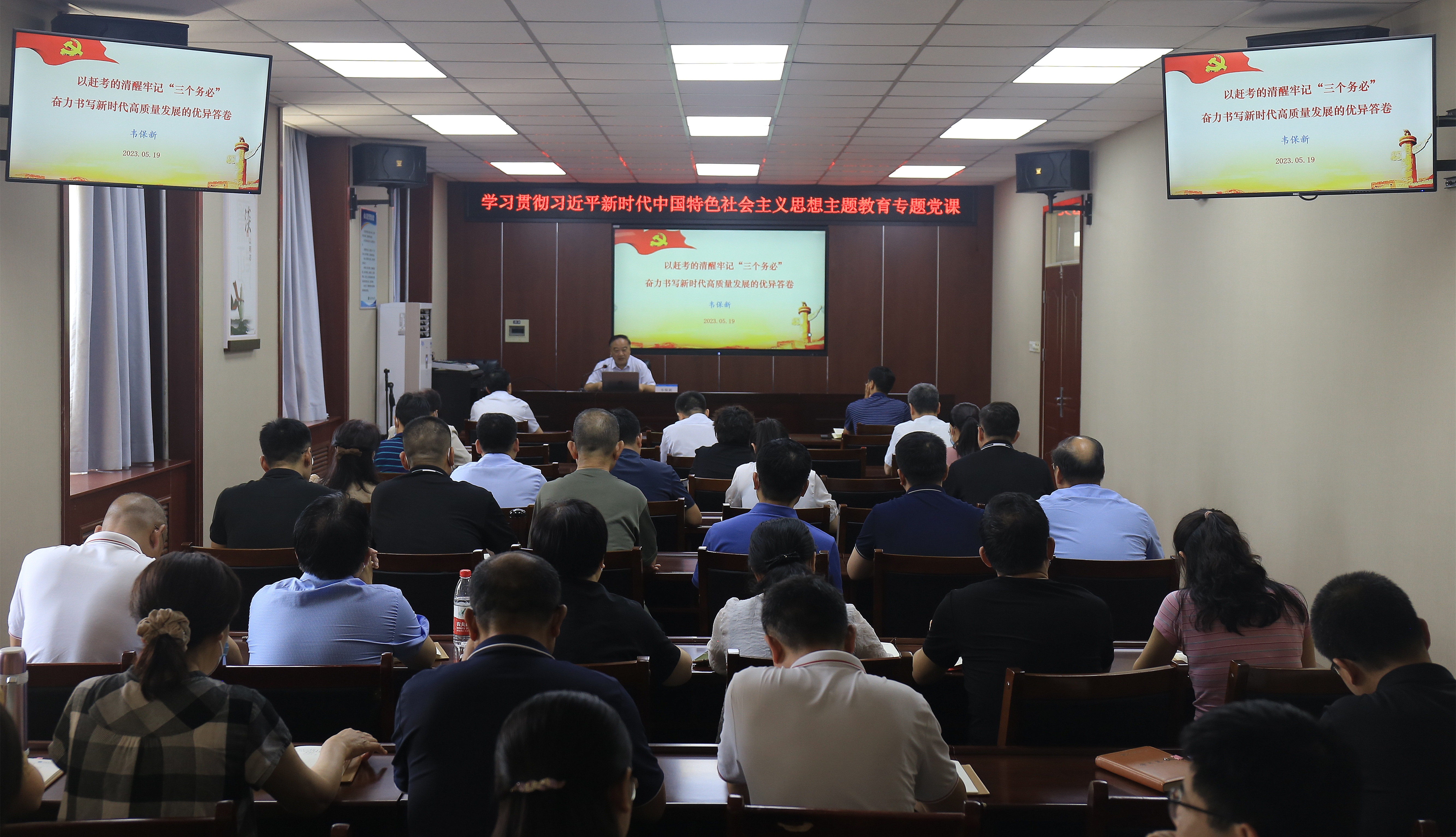 根据学院党委学习贯彻习近平新时代中国特色社会主义思想主题教育工作安排,5月19日下午,党委书记韦保新在二楼视频会议室以“以赶考的清醒牢记‘三个务必’,奋力书写新时代高质量发展的优异答卷”为题讲授专题党课。在校院领导,各党总支书记、直属党支部书记,以及全体中层干部聆听党课。