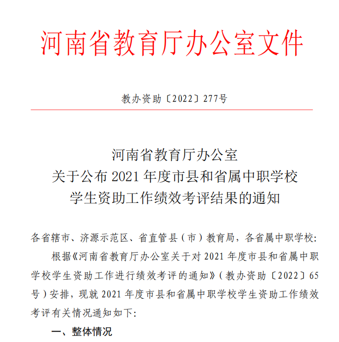 近日,河南省教育厅公布了我省2021年度学生资助工作绩效考评结果(教办资助〔2022〕277号),我院中职学生资助工作考核评价再次获得“优秀”等级。