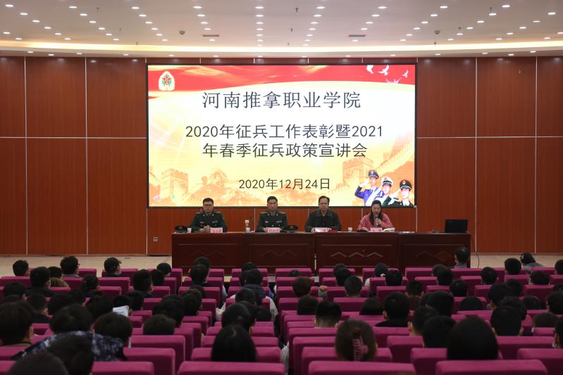 为做好大学生应征入伍工作,12月24日下午,学院邀请洛龙区人民武装部部长智建国、副部长马万超来院开展专题政策宣讲,并对2020年征兵工作先进单位和个人进行了表彰。学院武装部负责同志、各系部辅导员(班主任)及学生代表400余人参加。