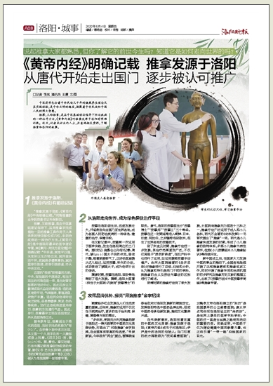 编者按:6月4日,《洛阳晚报》整版刊载“《黄帝内经》明确记载:推拿发源于洛阳 从唐代开始走出国门”文章,讲述“河洛推拿”的承继与发展,全文如下: