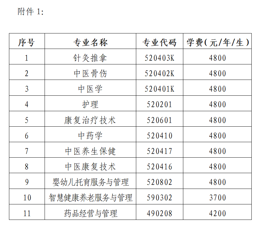 学院开设有针灸推拿、中医骨伤、中医学、护理、康复治疗技术、中药学、中医养生保健、中医康复技术、婴幼儿托育服务与管理、智慧健康养老服务与管理、药品经营与管理等专业,生源遍布全国各省、市、自治区。