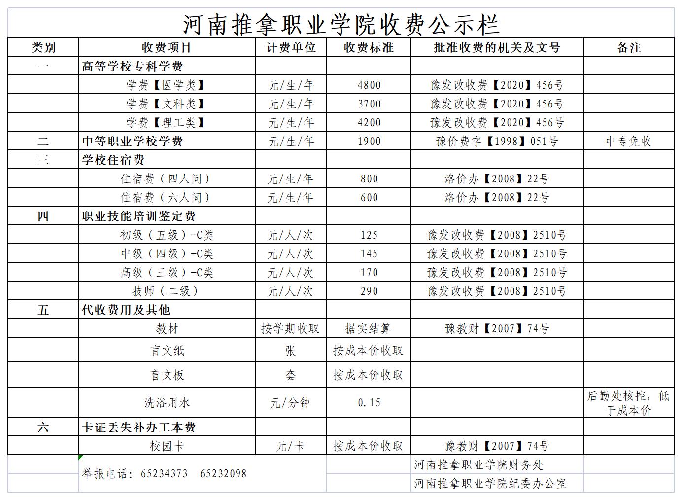 河南推拿职业学院收费公示信息