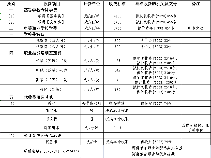 河南推拿职业学院收费公示信息
