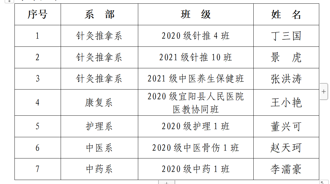 按照《河南省教育厅办公室关于做好2022年高校学生国家奖助学金评审发放工作的通知》(豫教资〔2022〕28号)要求和《河南推拿职业学院学生奖助学金评定办法》(院政〔2020〕66号)规定,经学生个人申请,系部学生资助工作组初步评议,学生处(学生资助管理中心)审查,学院国家奖学金评审小组民主评议,学院学生资助工作领导小组审定,拟推荐针灸推拿系丁三国等7名学生为学院2022年国家奖学金推荐人选,学生名单如下:
