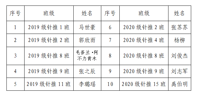 根据《河南推拿职业学院“好轻松奖学金”评定办法》,经班级民主评议小组推荐,系部学生资助工作组初审,学生处(学生资助管理中心)复审,学院学生资助工作领导小组审定,拟推荐马世豪等10名同学获得2020-2021学年“好轻松奖学金”。