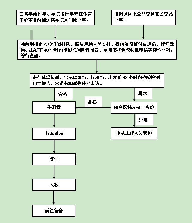 3.遵守入校流程安排。入校检测前须戴口罩,提前准备返校获批申请、健康绿码、行程绿码、出发前48小时内核酸检测阴性报告、承诺书等迎检材料,间隔1米按指定流程办理入校手续,流程为:测体温→查验健康码、行程卡→出发前48小时内核酸检测阴性报告、承诺书和返校获批申请等迎检材料→手消毒→行李消毒→入校。各环节无异议后方可入校,任何环节有异常,请服从工作人员安排;入校后,请同学们及时配合系部做好返校行程信息登记。
