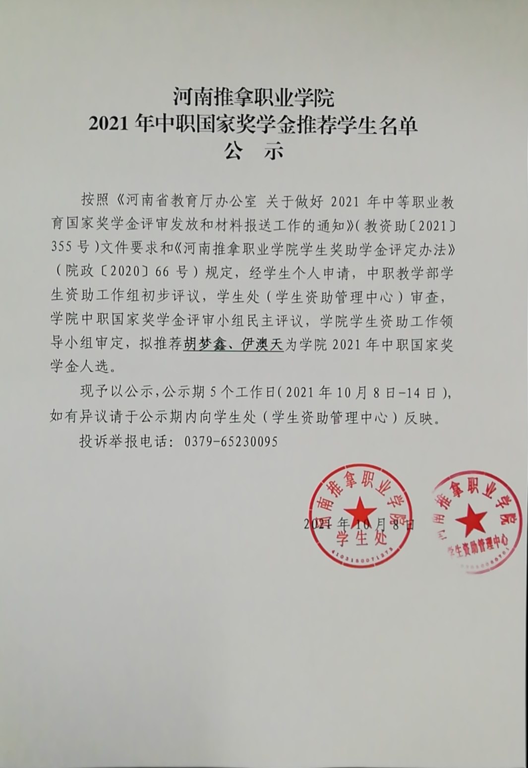 按照《河南省教育厅办公室 关于做好2021年中等职业教育国家奖学金评审发放和材料报送工作的通知》(教资助〔2021〕355号)文件要求和《河南推拿职业学院学生奖助学金评定办法》(院政〔2020〕66号)规定,经学生个人申请,中职教学部学生资助工作组初步评议,学生处(学生资助管理中心)审查,学院中职国家奖学金评审小组民主评议,学院学生资助工作领导小组审定,拟推荐胡梦鑫、伊澳天为学院2021年中职国家奖学金人选。