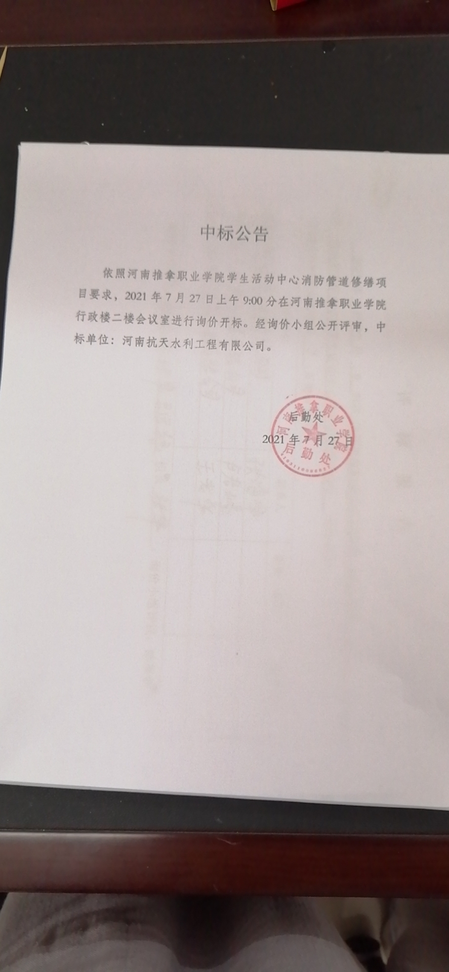 依照河南推拿职业学院学生活动中心消防管道修缮项目要求,2021年7月27 日上午 9∶00分在河南推拿职业学院行政楼二楼会议室进行询价开标。经询价小组公开评审,中标单位∶河南抗天水利工程有限公司。