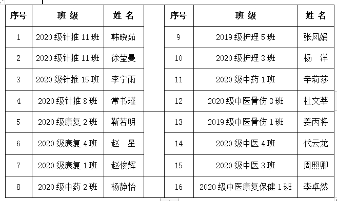 根据《河南推拿职业学院“泽腾助学金”评定办法》,经班级民主评议小组推荐,系部学生资助工作组初审,学生处(学生资助管理中心)复审,学院学生资助工作领导小组审定,拟推荐韩晓茹等16名同学获得2020——2021学年“泽腾助学金”。