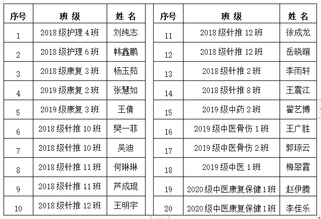 根据《河南推拿职业学院“京洛自强助学金”评定办法》,经班级民主评议小组推荐,系部学生资助工作组初审,学生处(学生资助管理中心)复审,学院学生资助工作领导小组审定,拟推荐刘纯志等20名同学获得2020-2021学年“京洛自强助学金”。