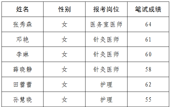 经研究护理岗位按1:2面试,医务室医师岗位未达到竞争比例取消招聘。参加面试人员如下: