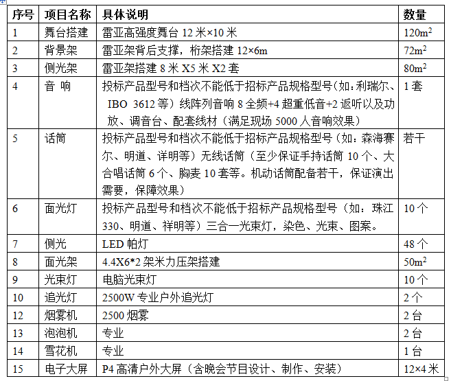 2.投标人具有近三年参加大型晚会工作业绩;舞台搭建及设备运用各环节负责人必须为专业人士(灯光师、音响师需提供相关资格证书或与贵公司签署雇佣合同),且晚会当天18:00-21:00专业人士必须在现场(晚会前灯光师及音响师需多次与晚会演出人员彩排,以便保证整场晚会零差错、零失误)。