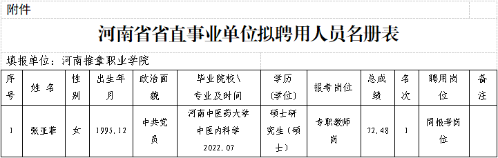 按照省人社厅网站上公布《河南推拿职业学院2024年公开招聘工作人员方案》的有关要求,我院认真组织了2024年公开招聘工作,计划面向社会公开招聘20人。通过报名、资格审核、笔试、面试、体检和考察确定第二批拟聘用人员1名(第一批已聘用19名)。拟聘人员名单见附件,现予以公示。