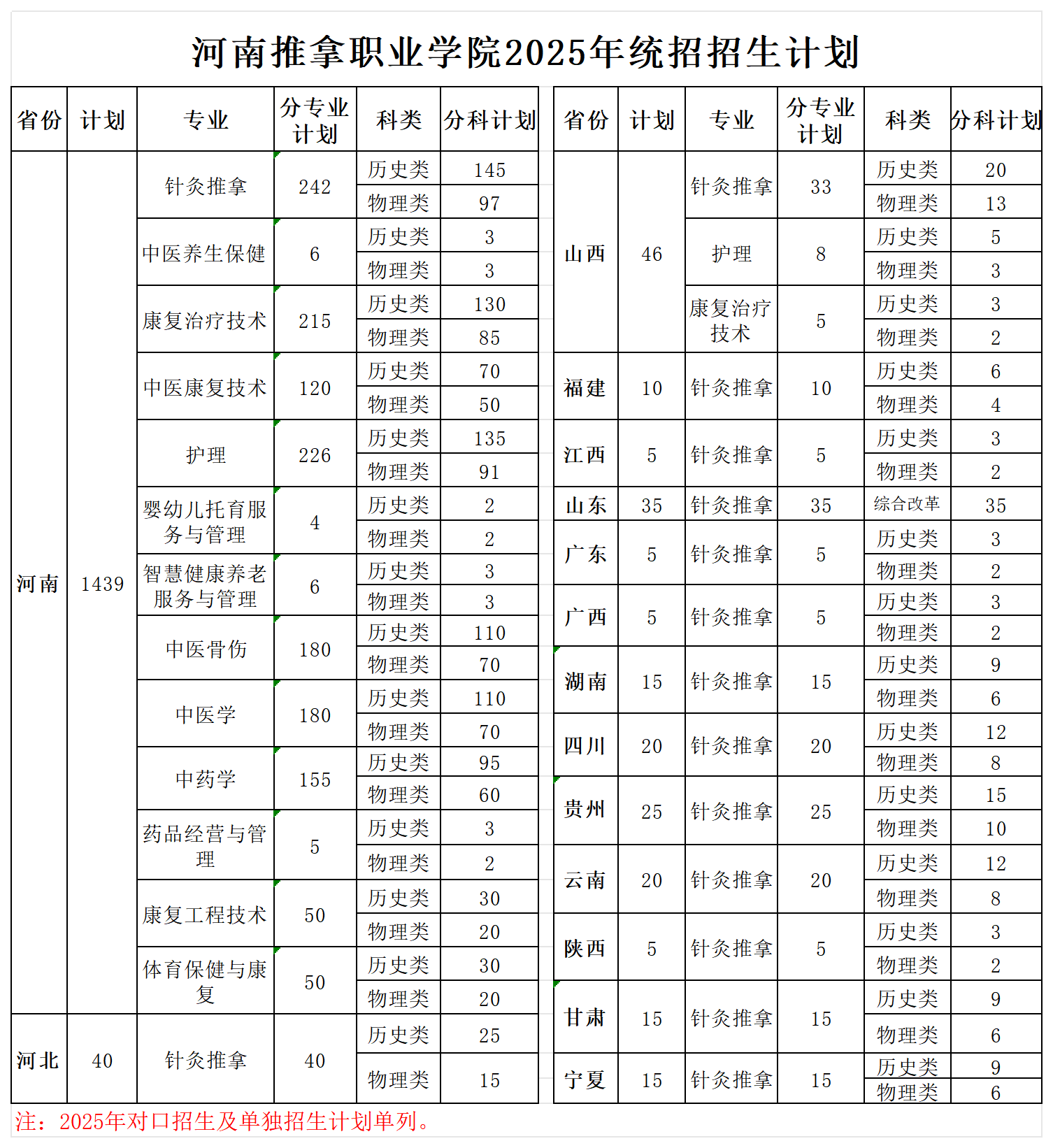 河南推拿职业学院2025年统招招生计划