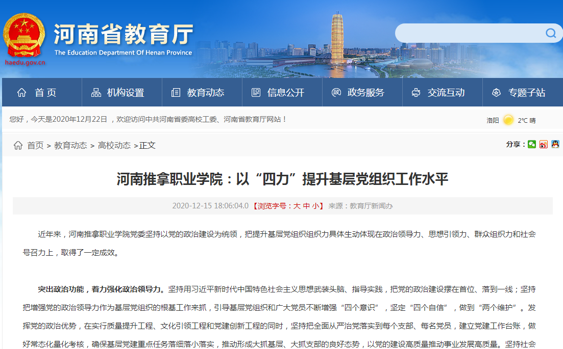 12月15日,省教育厅官网高校动态栏目以“河南推拿职业学院:以‘四力’提升基层党组织工作水平”为题报道了我院基层党组织建设工作。全文如下: 近年来,河南推拿职业学院党委坚持以党的政治建设为统领,...