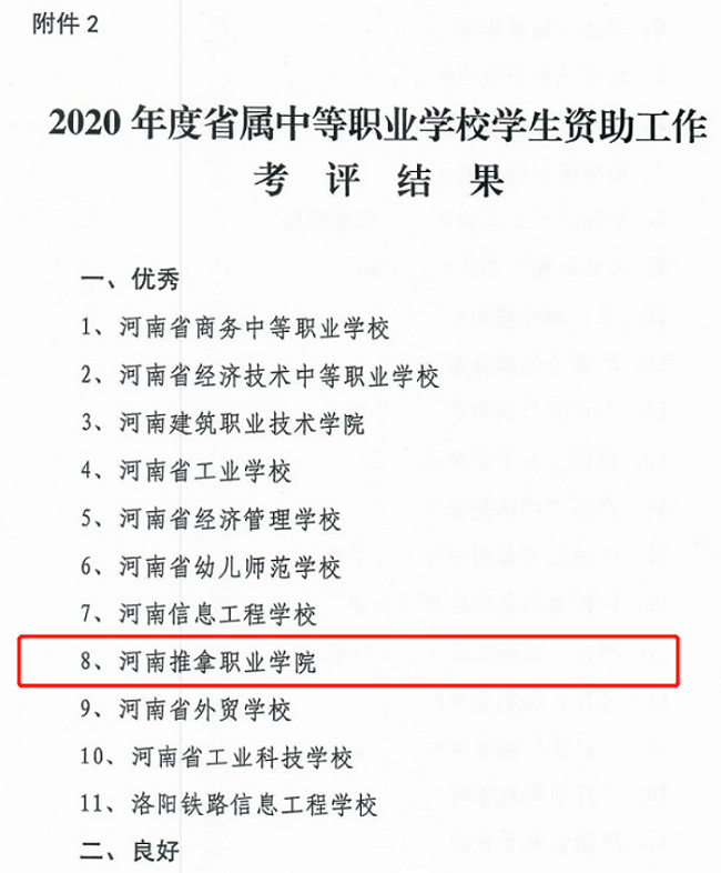 近日,河南省教育厅学生资助管理中心公布了我省2020年度学生资助工作绩效考评结果,我院中职学生资助工作考核评价获得 “优秀”等级。据悉,本次全省共有42所省属中职学校参与考评,其中11所学校获得“优秀”等级,21所“...