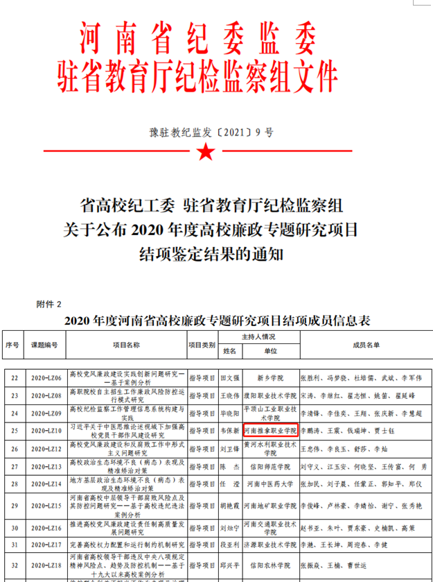 近日,省高校纪工委、驻省教育厅纪检监察组下发通知,公布了2020年度高校廉政专题研究项目结项鉴定结果,我院党委书记韦保新同志主持的指导项目《习近平关于中医思维论述视域下加强高校党员干部作风建设研究》顺利结项。...